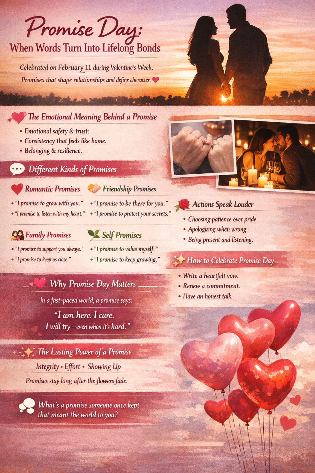 Celebrated on February 11 as part of Valentine’s Week, Promise Day is a gentle yet powerful reminder that love is sustained not by grand moments alone, but by the quiet, steady commitments we make to one another. It’s the day when feelings become intentions, and intentions become promises — the kind that shape relationships and define character. 💖