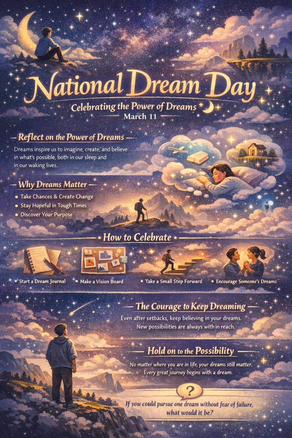 Every year on March 11, National Dream Day invites people to reflect on one of the most powerful forces in human life: the ability to dream. Whether those dreams occur in the quiet mystery of sleep or live deep within our hearts as hopes for the future, they shape the way we see the world and our place in it.