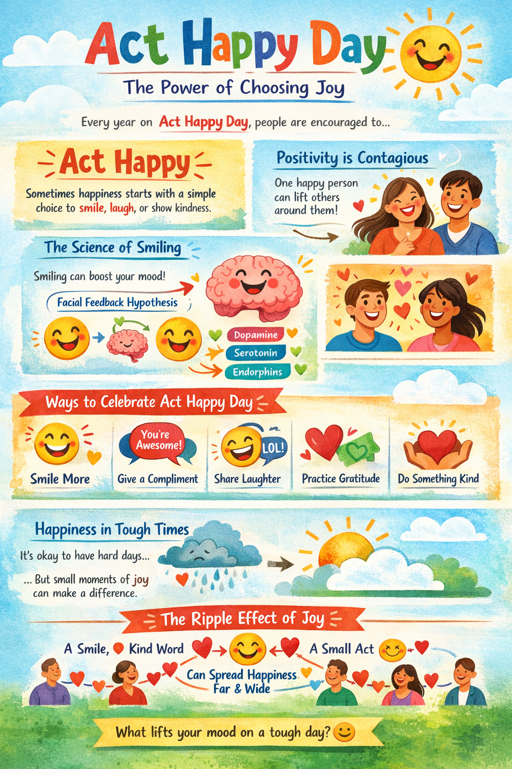 Act Happy Day is a reminder that our emotions and actions are more connected than we often realize. Sometimes happiness follows life’s good moments. Other times, happiness begins with a decision to change how we approach the day.