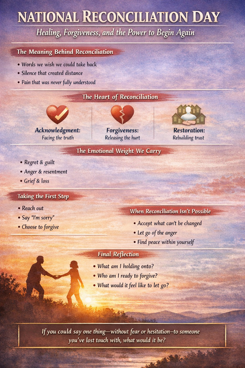 In a world that often feels fractured by misunderstanding, loss, and unresolved pain, National Reconciliation Day rises as a quiet but powerful call—to heal, to forgive, and to find our way back to one another.