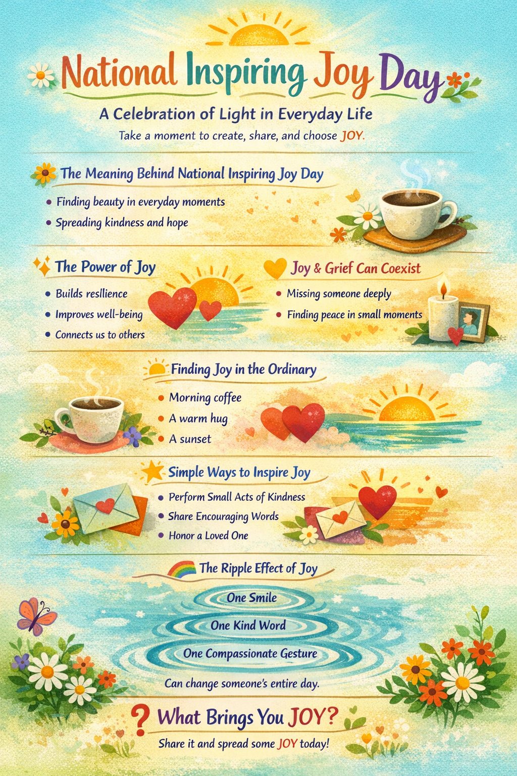 In a world that often feels fast, overwhelming, and uncertain, National Inspiring Joy Day stands as a gentle invitation—to slow down, to notice, and to choose joy. Not the kind of joy that depends on everything going right, but the kind that quietly lives in the background of our everyday lives, waiting to be discovered.